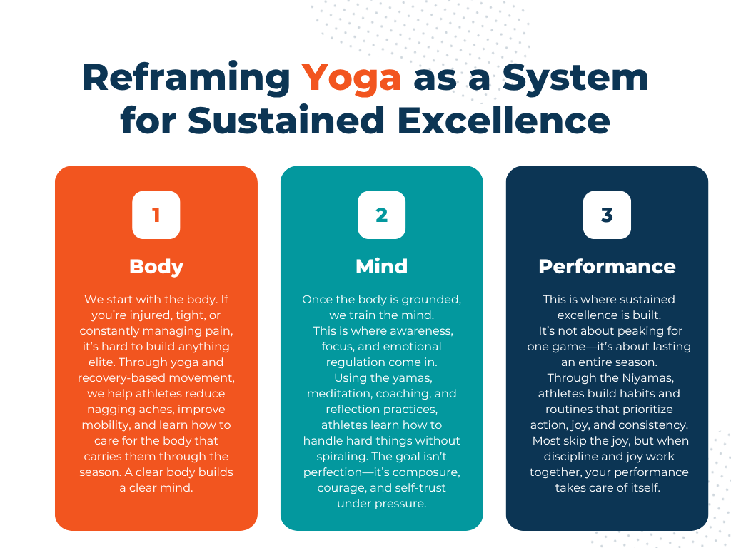 When players understand who they are, what they want, and most importantly, why they want it - we can finally have an honest conversation about what it's going to take to get there. From here, they can settle into the work and receive the feedback and coaching they need in order to reach their next level. The last step is what we call the Discipline of Joy and this is where they learn to prioritize their wellbeing, chase big goals, and create systems to sustain high achievement without running themselves into the ground. This is where we reframe what yoga can be (and do) for athletes by teaching the philosophies that have been used for centuries to handle the ups and downs of life with grace, resilience and intention.